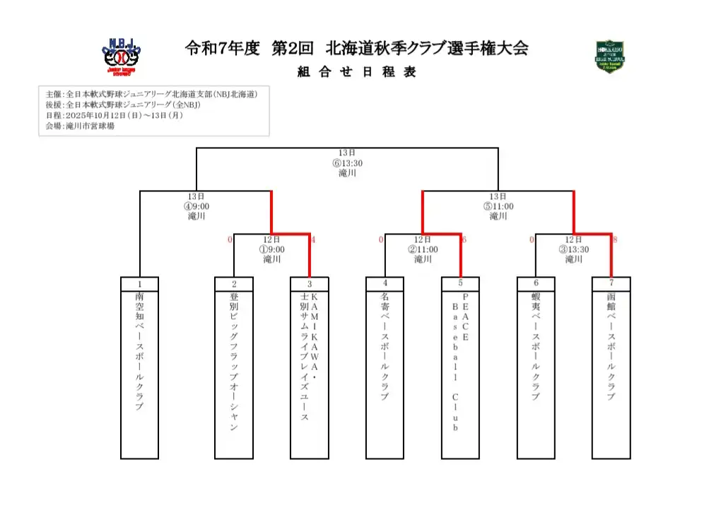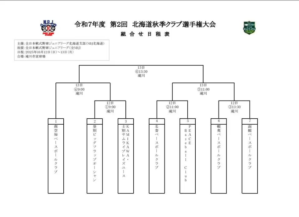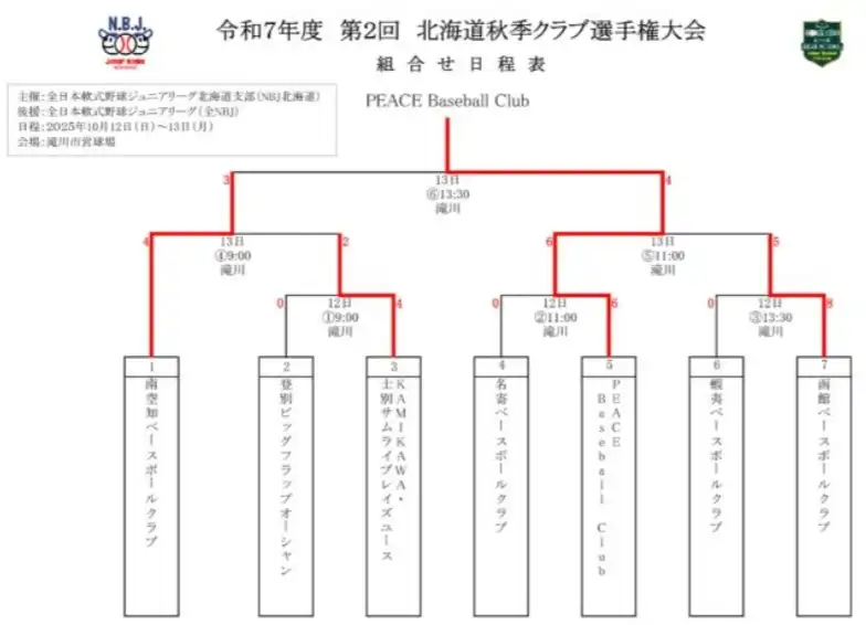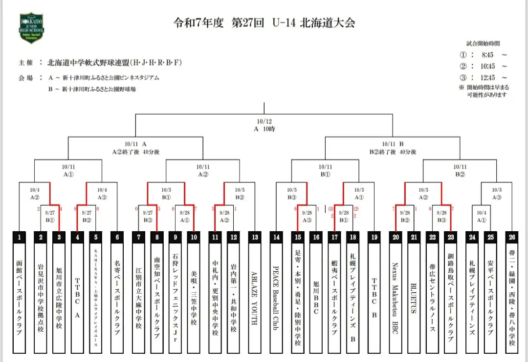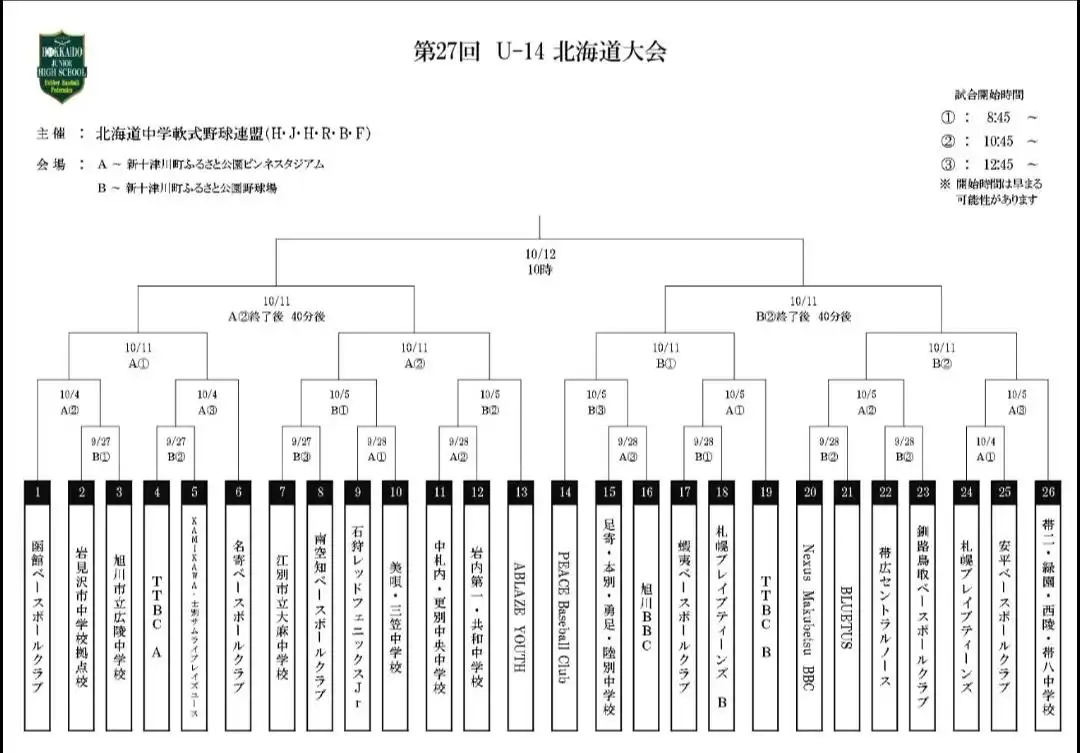 お知らせ【U-14北海道大会】U-14北海道大会の組合せが決まりました。初戦が10月5日(日)2回戦、新十津川ふるさと公園野球場にて行われます。応援よろしくお願いいたします。